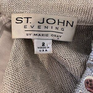 St. John Knits evening pant suit. Matching jacket and pants. Jacket is silver knit with silver metal beading. Pants are white with slight stretch and have silver metal beading to match jacket going down side of legs. Pants are wide leg or slightly flared. Zipper on jacket has silver star and tassel zipper pull. Jacket is size 2 and pants are size 4. Original price of jacket was $1995 and pants were $1295.