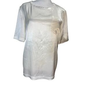 St. John Knits T-shirt, satin scoop neck top, short sleeve luxury shirt, St. John pocket tee, designer satin shirt, elegant casual top, women’s luxury T-shirt, St. John satin blouse, premium knitwear, St. John satin tee, sophisticated satin top, high-end fashion top, St. John Knits satin T-shirt, classic scoop neck tee, St. John satin pocket shirt
