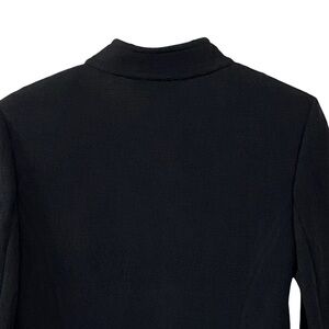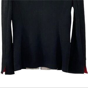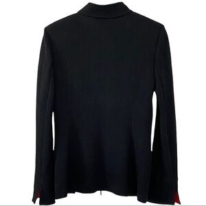 Preowned. Like new. Smoke-free environment. Black and Cream with a Red Cuff inlay. 2” slits in sleeve cuff. Two pockets. Full zipper closure. Padded shoulders.