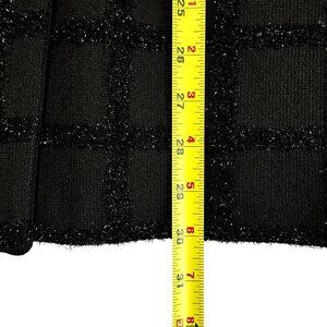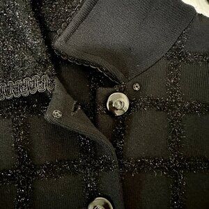 Elegant St. John Collection cardigan in signature Santana Knit. Features a textured black grid pattern woven with subtle metallic thread for a sophisticated shimmer. Styled with glossy logo buttons, front flap pockets, and contrast knit trim. Timeless mid-weight piece ideal for layering or evening wear.tallic accents, button closures, and front pockets. Versatile for business or evening wear.