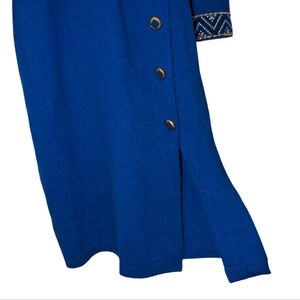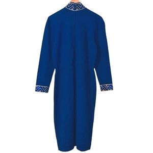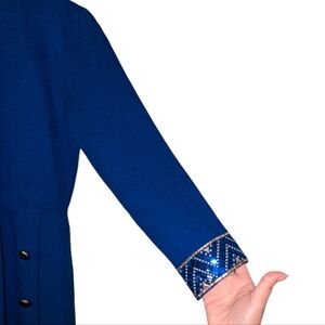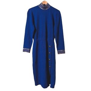 Vintage St John Marie Grey Size 8 Color: Blue Santana Knit Embellished Sequin Collar and Cuffs Faux Button Down Front Slit Modest High Neck Zip Back Closure Sheath Long Sleeve Knee Length Evening Dress Condition: Pre-owned, has some missing sequins at the collar but not noticeable Measurements: Pit to pit: Length: night, church, wedding, party, career Wear, dinner, fancy, cocktail, luxury, designer, vintage, Winter, cobalt, unique, fun,