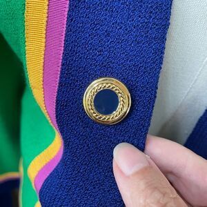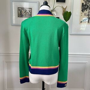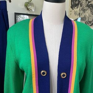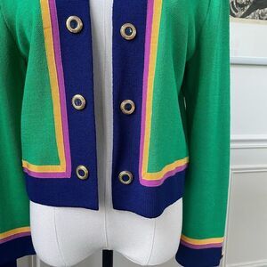 St. John by Marie Gray Santana knit open front cardigan or jacket in Kelly Green with cobalt blue trim and pink and golden yellow grossgrain ribbon trim. The buttons are gold with blue. Made in the USA. Shoulder pads. Laying flat measures 20.5 inches shoulder to hem and 21 inches armpit to armpit with about 4 1/2 inch opening in front. No holes or snags.