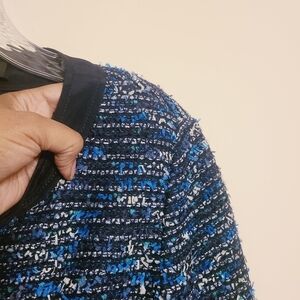 Women's navy blue and white patterned, two-piece, wool blend skirt and jacket suit set by St. John, size 8. Jacket is open, has a tir closure, shoulder pads and two sets of front pockets; skirt is an A-line with a hidden back zipper. Excellent pre-owned condition, no flaws.