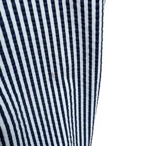 This St. John navy and white striped seersucker jacket channels timeless nautical elegance with a modern edge. It features a mock neck and front zip closure for clean lines, while zippered cuffs and padded shoulders add structure. Belt loops hint at a cinched waist (original belt not included), and gold-tone hardware brings a luxe finish. The brand and size tag have been removed, but flat measurements confirm an XL fit. Crafted from a breathable cotton-blend, it’s perfect for coastal outings, weekend brunches, or city strolls.