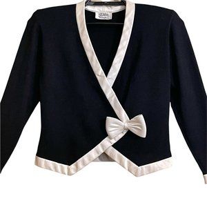 Features: formal, short length, satin trim, santana knit, shoulder pads, made in USA, double snap surplice front, breathable, no content tag, front satin bow, Vintage