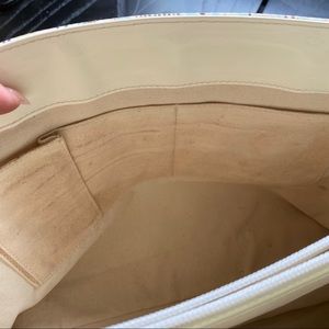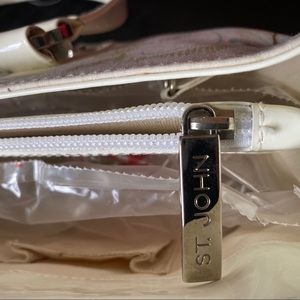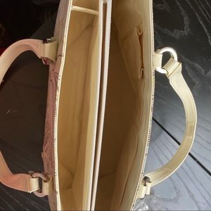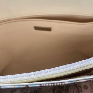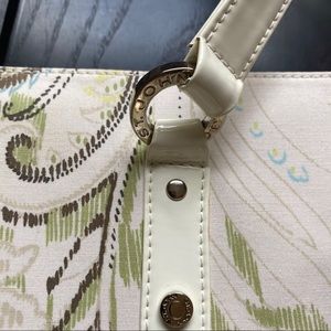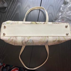 St. John designer tote bag features a light pastel colored scroll print allover.