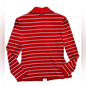 beautiful sweater/jacket for all seasons-classic for your wardrobe. Color is red with white stripes and gold/cream button/zipper details up the front. Little rust like spot on left side of chest. Otherwise, in like new condition!!