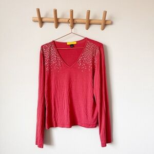 St. John Red V Neck Tee with Embellishments