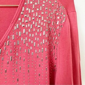 In excellent condition with no visible flaws. Reddish color soft tee shirt with v neck and silver metal embellishments on the shoulders.