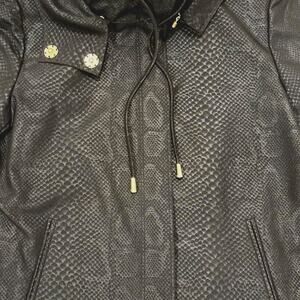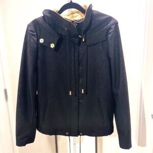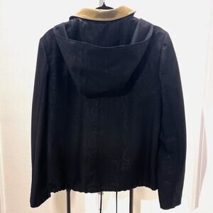 From the St. John Resort 2009 Collection, this luxe jacket blends modern edge with timeless sophistication. Crafted in textured black fabric with a subtle snakeskin pattern, it features bold gold-tone accents and a dramatic detachable metallic hood. A rare archival designer statement piece perfect for elevating career wear, streetwear, or evening looks.