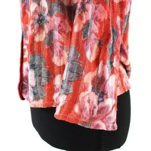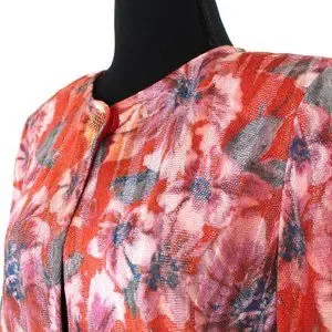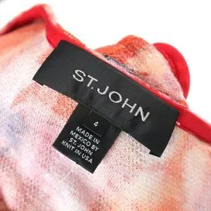St. John Ribbed Red Abstract Floral Pattern Rhinestone Button Sweater Cardigan