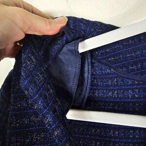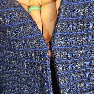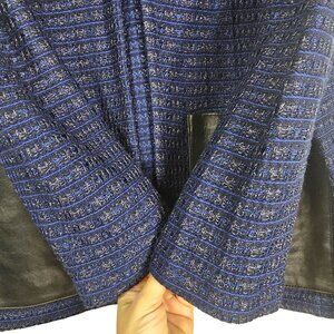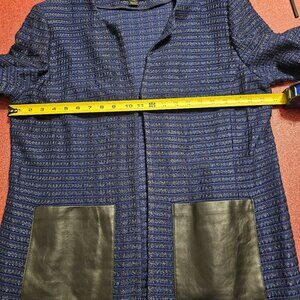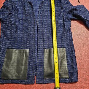 St. John jacket, navy knit jacket, leather pocket jacket, women's wool jacket, open front blazer, textured knit blazer, size 16 jacket, casual blazer, professional attire, designer jacket, women's St. John, navy open jacket, wool blend jacket, Santana knit, tweed, office, formal, old money, quiet luxury, luxury, designer, supple leather, business, timeless, multimedia, mixed media