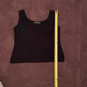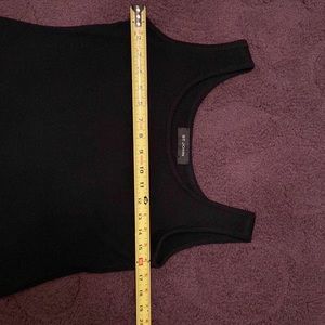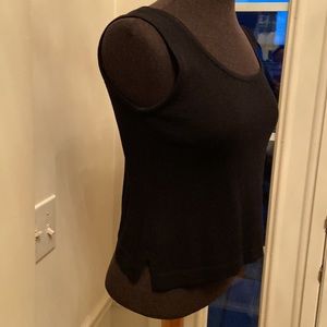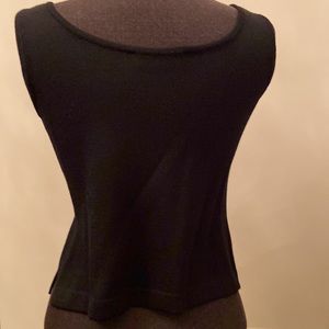 Black sleeveless Santana knit. Pull over tank styled. Side vents. No size tag. Fits small to medium. EUC