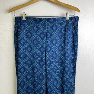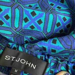 This listing is for a pair of St John Womens Printed Silk Blend Ankle Pants. Pull on / elastic waist / pockets. Multicolor print on silk twill. Metal logo plaque at the front by the pocket. Thin white stripe at the outer legs. Silk/Spandex.