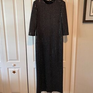 A captivating evening wear statement! Gorgeous intricate metallic threading throughout. Crew neckline and a sleek silhouette embody elegance. PTP: 18.5 inches. Length: 56 inches. EUC. Slight padding at shoulder. Back slit for easy walking. True to size.