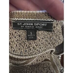Elevate your wardrobe with this classic St. John Sport sweater vest. The beige crochet fabric, with metallic stripes, offers a touch of elegance and vintage charm. The crew neck and sleeveless design make it perfect for layering, while the lightweight and stretchy material ensure a comfortable fit.