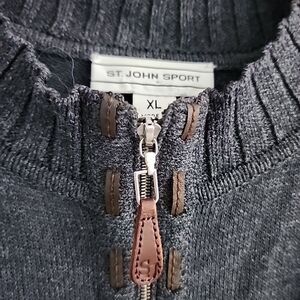 St John Sport Luxury Gray Cardigan Wool Blend W/ Leather Trim Full Zip XL USA