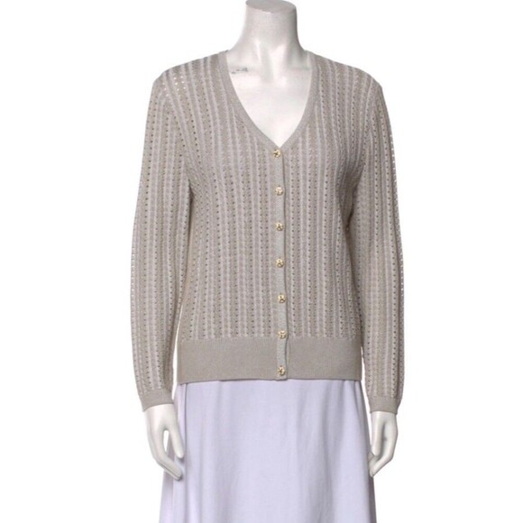 St John Sport Marie Gray Tan Gold Starfish Button Up Cardigan Wool Blend Sz L