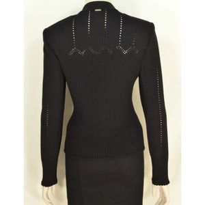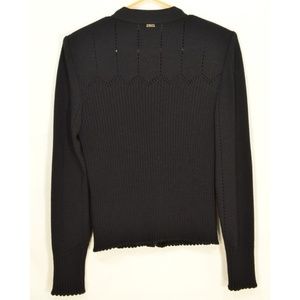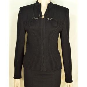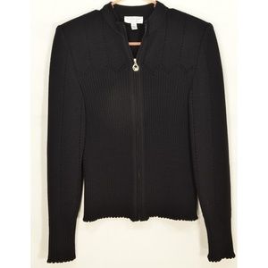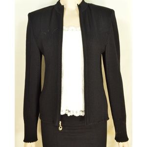 Beautiful pre-owned St John Sport Marie Gary jacket, Santana knit, jet black, knit pattern of ribs and holes, zipper front close, lightweight shoulder pads, crew neck collar, chic perfect for office or career.