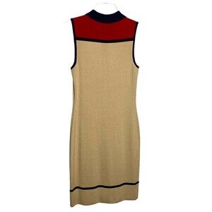 St John Santana Knit Dress Beige latte size 6 Sheath Collar Gold Collar Buttons