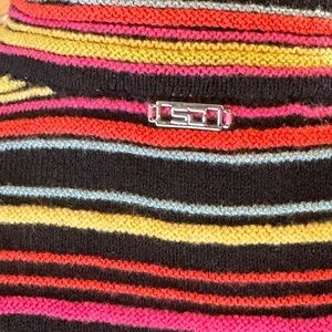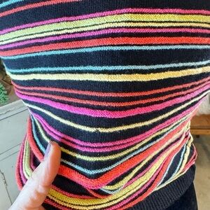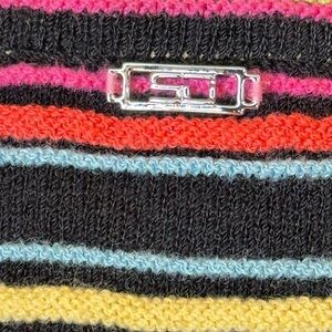 Add a pop of color to your wardrobe with this St. John Sport Santana knit sweater with a retro look. The multicolor stripes in black, orange, yellow, pink, and blue make this sweater perfect for any occasion, whether it's a party or a casual day out. The mock neck and sleeveless design provide a chic and comfortable fit, while the tight-knit wool and rayon blend ensures warmth during the colder seasons.