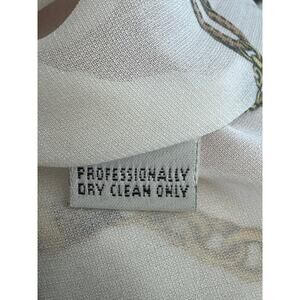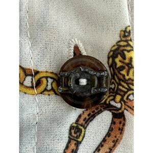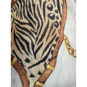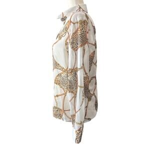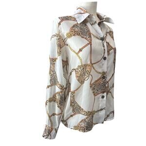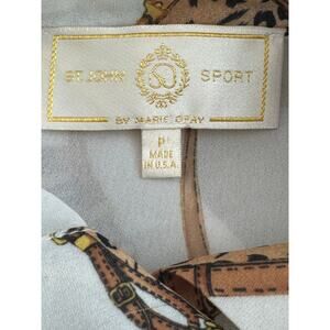 Good preowned condition and see the last photo for a almost invisible pull in the front on the animal print, this is a St John Sport creamy white background blouse that has brown and black animal print along with leather look straps and brass look medallions. Long sleeves with button wrists. This is a dry, clean, only blouse, and there is no fabric content available. measurements are taken as closest as possible and are approximate.