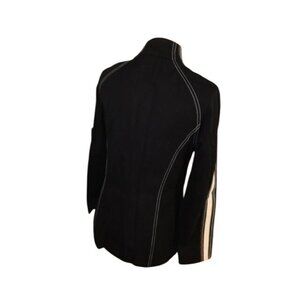 This chic zip jacket from St. John Sport features a stylish navy blue and white color scheme, perfect for a sporty yet designer look. Ideal for petite frames, it combines fashion with function for any casual outing. Stand collared neckline, zip front, long sleeves, stretch twill fabric with contrasting white stitching and textured leather (not sure if faux or real but feels real)- 2 front pockets and super super cute