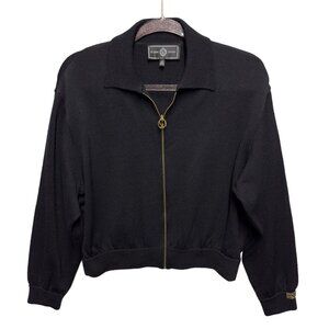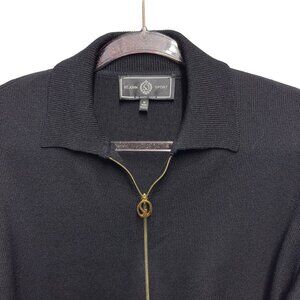 *Accepting Offers* New without tag. St John Sport by Mary Gray thick structured sweater knit soft cozy comfy jacket coat cardigan in black, gold embroidered monogram on wrist, long sleeve, polo collar, golden zip up, size M.