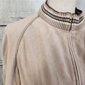 Velour beige zip front track style jacket with stand up collar and ribbed striped cuffs, hem, and collar. Snap closure pockets. In good used condition. Refer to photos for missing zipper pull and small black stain on the back of the lower right sleeve.