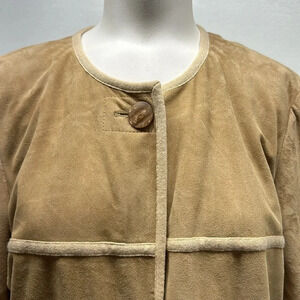 St John 100% Suede Leather Coat Jacket Cashmere Lined Pockets Tan Beige Womens Size 8