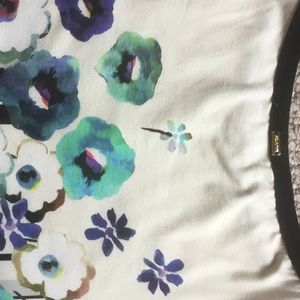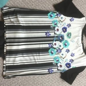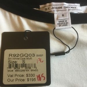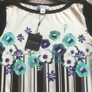 If you love St. John, you'll love this top. The boat neck and black sleeves provide a dramatic frame for the beautiful flowers on top of the black and cream stripes. It hugs the curves like a tender embrace. The size is small but it can easily be worn by a medium.