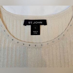 St. John Top Studded Neck line Ribbed Cream Short Sleeve Shirt Sz Large Vintage