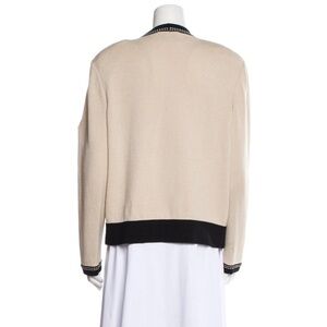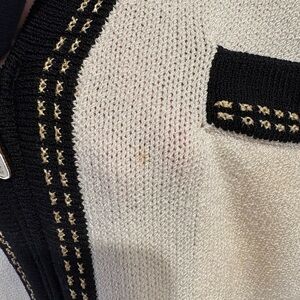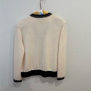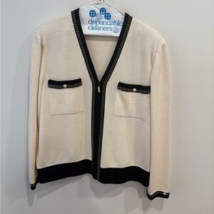 Stylish cream cardigan with black studded trim. Features two front pockets, zip front with St. John hardware, and shoulder pads. Does have a small (pea size) stain on the front that is pictured, but otherwise in great condition.