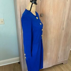 St. John Vintage 80’s Santana Knit Long Sleeve Sweater Dress blue gold button 4