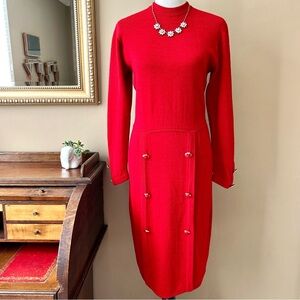 St. John Vintage Red Santana Knit Long Sleeve Sheath Dress Enamel Buttons Size 8