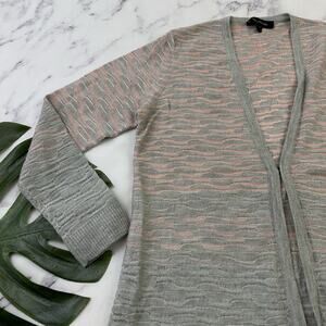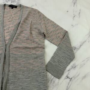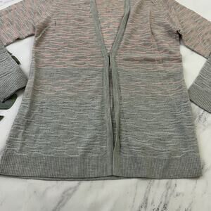 St. John women's gray and pink ombre wool blend cardigan sweater, size S. It is free from any rips or stains. It measures about 40 inches around the bust and is about 30 inches long.