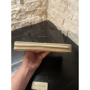This is a St. John women's wallet that is zip-around style and made of genuine patent leather. It comes in a cream/ivory color and has a quilted accent. The wallet is brand new in its original box and has features such as credit card slots.