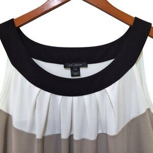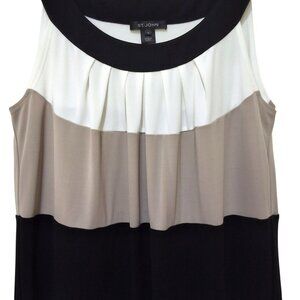 A refined sleeveless knit top featuring a classic bateau neckline and a sophisticated colorblock design in white, black, and taupe hues. Designed with a flowing silhouette, this St. John piece is ideal for polished yet comfortable wear, offering timeless style for professional or elevated casual settings.