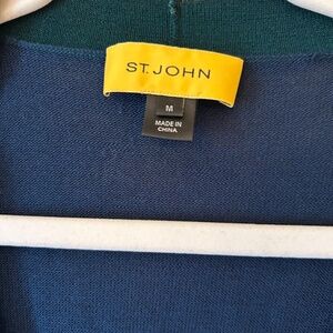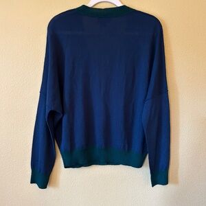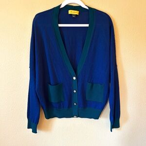 Women's St. John Yellow Label cardigan sweater, lightweight, wool/rayon mix, gold tone buttons, dark blue with dark green trim, size medium
