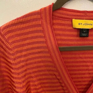 St. John Yellow Tag Striped Cardigan Sweater Orange Size Medium. Jersey knit, wool blend. This cardigan is pre-owned. Good condition. No flaws. Measurements: 18 inch chest 17.5 inch waist 23.5 inch length 25 inch arm length