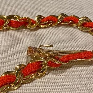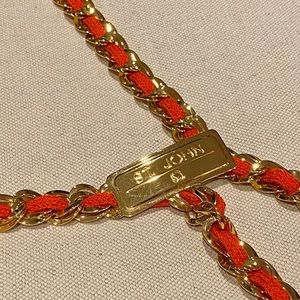 Very unique St. John belt in gold and vibrant orange. Because of the design, you can wear however you want - cinching in your waist or around the hips. It is 46” long but can fit a number of sizes.