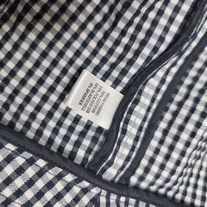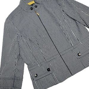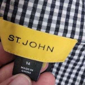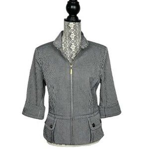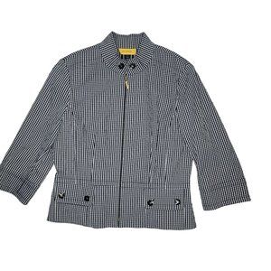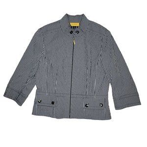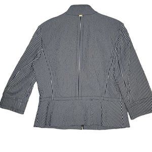 St. John black and white gingham check seersucker blazer. Fitted spring blazer/jacket with stretch. 3/4 sleeves that can fold up higher. Shoulder pads that are tacked in. Button close pockets with side entry as well. Zip close front, gold hardware. Size 14.