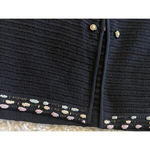 St John by Marie Gray Collection Sz 4 embroidered edge short sleeved sweater. Pit to pit 17.5 inches , length 25 inches. Embroidered edge. Sweater is stretchy. No pilling, snags or picks, however, three of the pearl buttons are missing the pearls. I could have removed the other pearls but for transparency, i left them alone. You can either pull the pearls off, replace or just leave them alone. Any questions, please DM me.