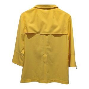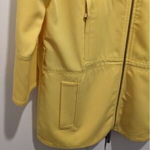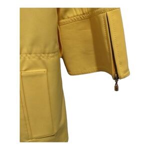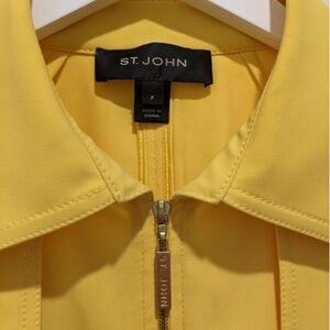St. John lightweight jacket in a bright canary/lemon yellow. Perfect for the spring sunshine. Features front zip pockets and lower front pouch pockets. The 3/4 sleeves have zippers as well.