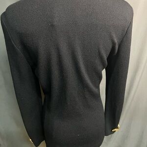 Black with gold medal clips knit sweater by St. John. This is a size 8. There is one small flaw in the sweater shown in the pic but it can not be seen unless up close
