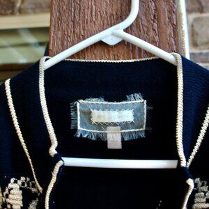 Lovely black and gold St. John sweater. This is black with gold embroidery all over the front and gold around the sleeves and neckline. This sweater zips up the front all the way. Size large, in good condition, no snags pulls.