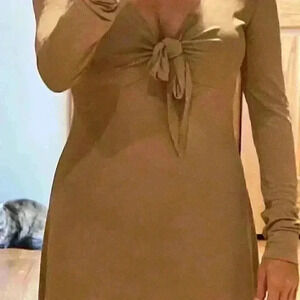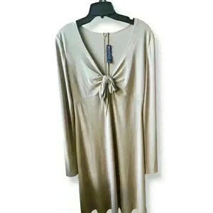 St. John long Sleeve Taupe Dress Size 2 in good used condition. The right sleeve has a couple of black marks that are depicted in in the photographs. I have not attempted to dry clean this dress to remove the marks.