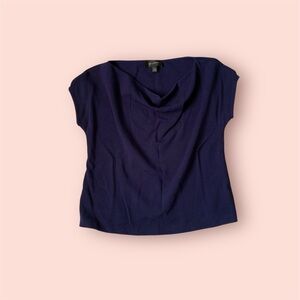 St. John short sleeve cowl neckline wool/rayon blouse. Size medium. In good preowned condition. Has two small black spots in the back as shown in pictures. No other flaws. Navy blue color.