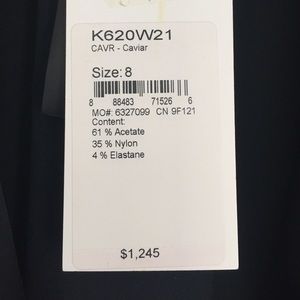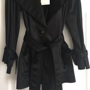 St. John shiny black dress jacket with single button, tie waist and tie details at cuffs