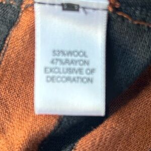 St. John sweater in black and white reddish brown stripes. St. John spell out in brass colored studs. Mock neck and sleeveless. Stretchy wool blend. Bust 18” length 23”. Excellent condition. Size M